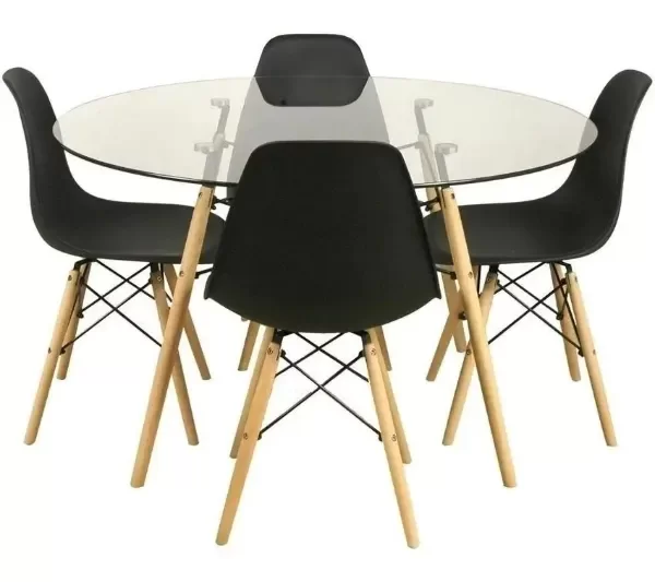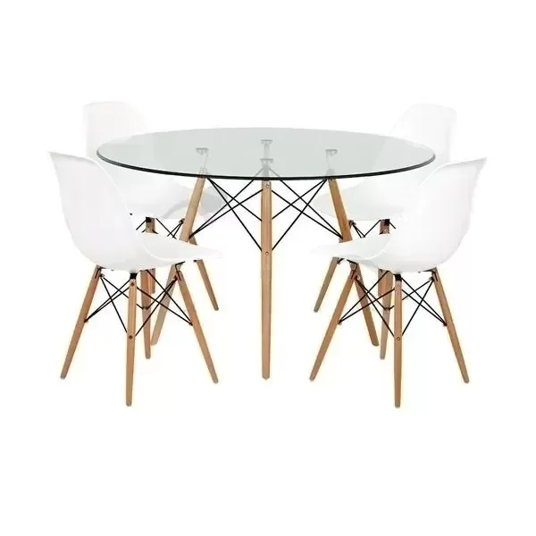 Este juego de comedor Eames está compuesto por una mesa redonda de vidrio templado de 120 cm y cuatro sillas Eames en colores blanco y negro. Una opción ideal para quienes buscan funcionalidad, diseño moderno y materiales de calidad en un solo conjunto.