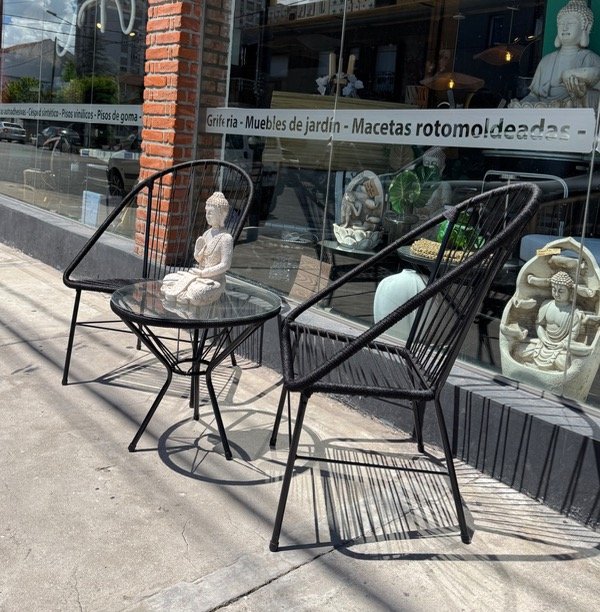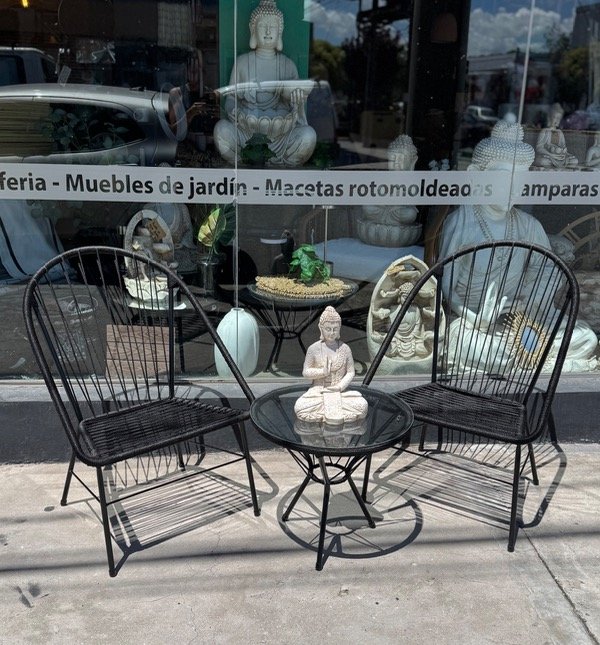 Juego ASUNCION 2 sillones + mesa ratona. Tejido en hilo simil yute color negro/beige. Estructura de caño