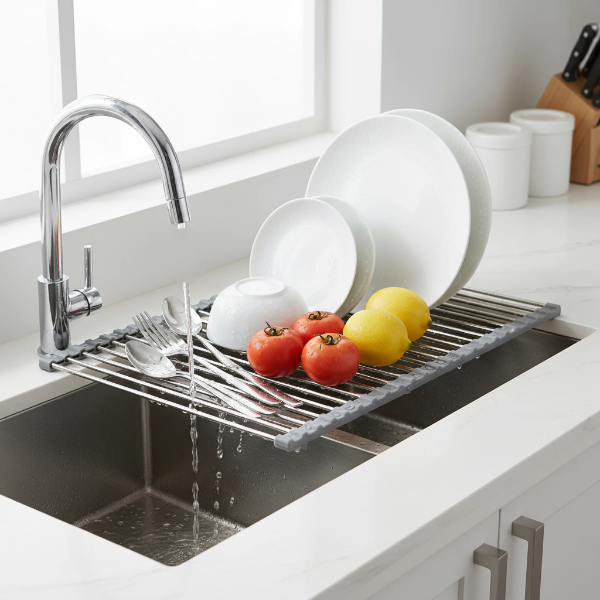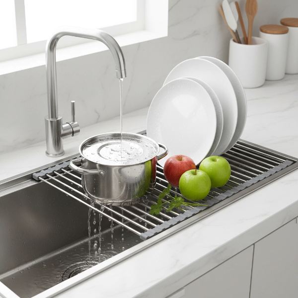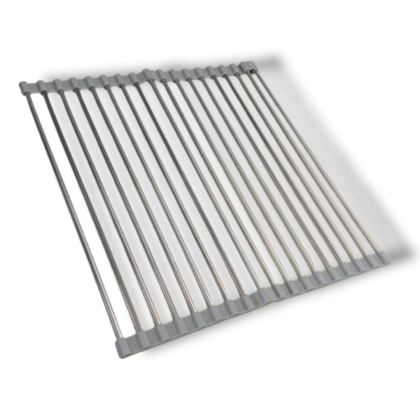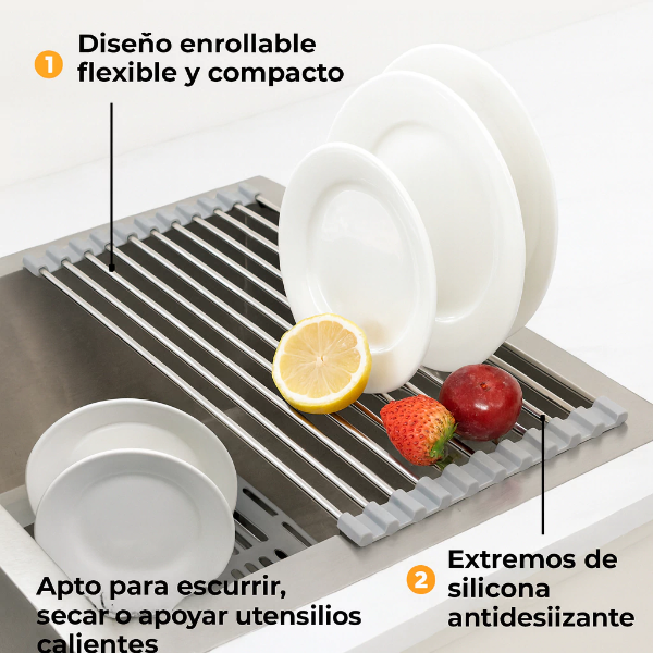 Escurridor de cocina metálico enrollable, ideal para colocar sobre la pileta y optimizar el espacio. Permite escurrir platos, frutas, verduras o utensilios directamente sobre el fregadero, manteniendo la mesada seca y ordenada. Su diseño compacto y flexible facilita guardarlo cuando no está en uso.