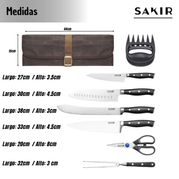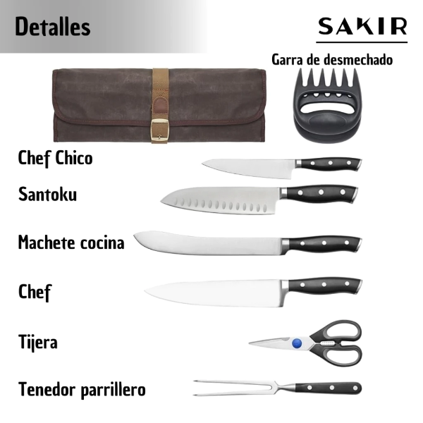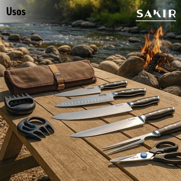 Este set "All-in-One" incluye todo lo necesario para cortar, picar, trozar y desmechar, todo organizado en un estuche enrollable de lona resistente estilo vintage, ideal para proteger tus herramientas y llevarlas contigo de camping, a una quinta o a la parrilla del domingo.