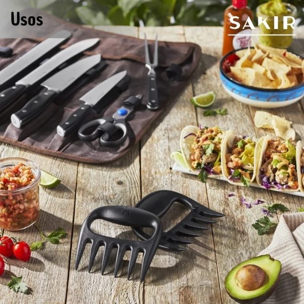 Accesorios Premium: Incluye garras de oso para desmechar carne (ideal para pulled pork o carnes braseadas) y una tijera de cocina multifunción.