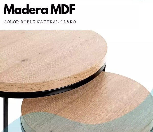 Tablero: La superficie de cada mesa está elaborada con MDF (Tablero de Fibra de Densidad Media) de alta calidad, recubierto con una lámina de roble claro que reproduce fielmente la textura y calidez de la madera natural. El MDF asegura una superficie lisa, resistente y de fácil mantenimiento.
