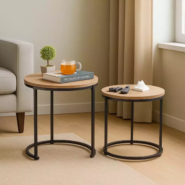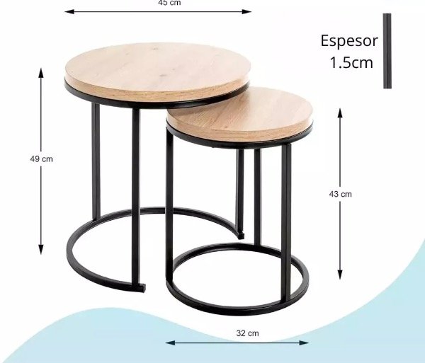 Optimice su espacio con nuestro elegante set de mesas auxiliares tipo nido, diseñado para ofrecer funcionalidad y un toque estético moderno. Este conjunto se compone de dos mesas de diferentes dimensiones, permitiendo una versatilidad de uso como mesas de centro, mesas laterales o elementos decorativos.