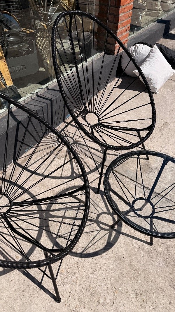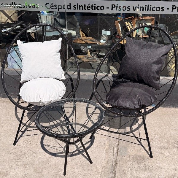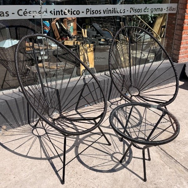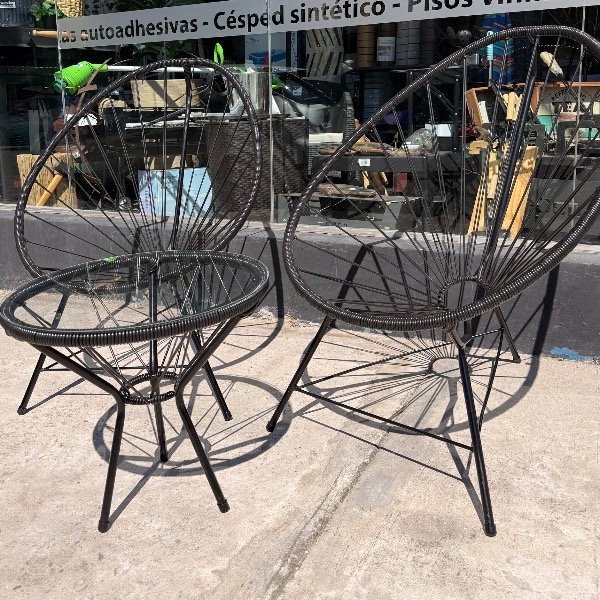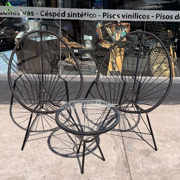 Incluye: 2 sillas Acapulco con estructura metálica y asiento tejido + 1 mesa auxiliar con tapa de vidrio