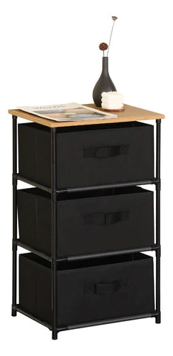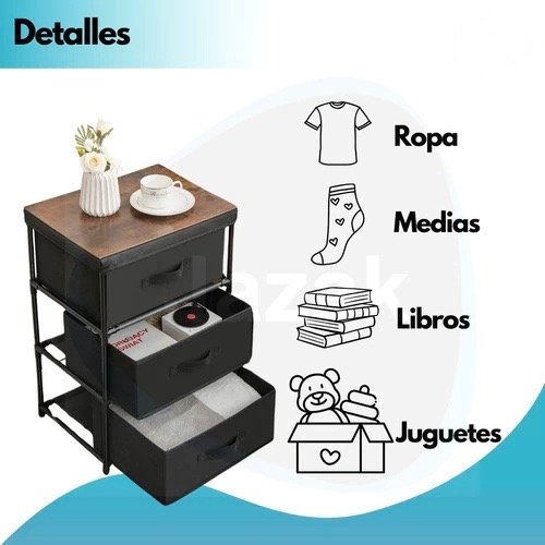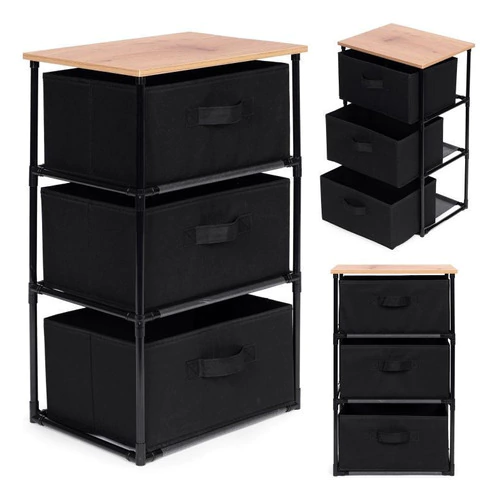 ¡Mantén tu hogar organizado con estilo con este práctico organizador de 3 cajones! Su diseño moderno y funcional lo convierte en la solución perfecta para cualquier espacio. Características Principales: 3 Cajones de Tela Resistente: Amplios y espaciosos, ideales para guardar ropa, accesorios, juguetes, o cualquier objeto que necesites tener a mano. Estructura Metálica Robusta: Garantiza estabilidad y durabilidad, soportando el peso de tus pertenencias sin problemas. Tapa Superior de Madera: Aporta un toque cálido y natural, convirtiéndola en una superficie adicional para colocar objetos decorativos o de uso diario. Diseño Industrial: La combinación de metal y madera le da un aspecto moderno y versátil que se adapta a cualquier estilo de decoración. Fácil Montaje: Incluye todas las herramientas e instrucciones necesarias para un ensamblaje rápido y sencillo. Estilo Moderno: Añade un toque industrial y elegante a tu hogar. Versatilidad: Ideal para dormitorios, salas de estar, baños, oficinas y más. Fácil Mantenimiento: Los cajones de tela son fáciles de limpiar y la estructura metálica se mantiene en perfecto estado con un simple paño húmedo. Especificaciones: Material: Tela no tejida, metal y madera Color: Negro con tapa de madera clara Medidas: 41 cm (ancho) x 31 cm (profundidad) x 63 cm (alto)