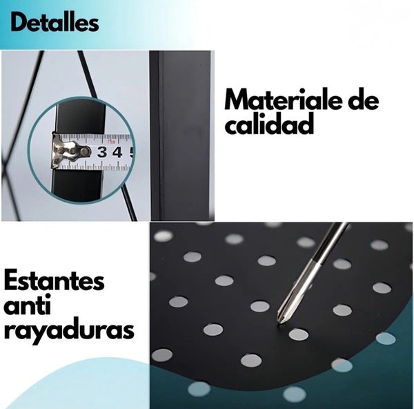 Estructura Resistente: Fabricada en acero de alta calidad con un acabado en pintura epoxi que asegura una excelente resistencia a la corrosión y el uso diario. Cada nivel cuenta con una superficie perforada que proporciona solidez y un toque moderno.
