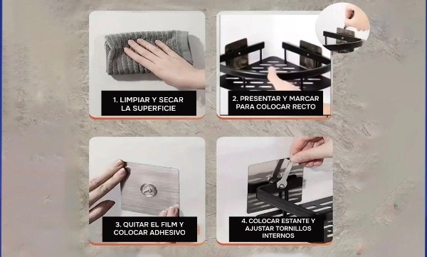 IMPORTANTE: Para su correcto funcionamiento limpiar la superficie, colocar los adhesivos haciendo presión en toda la superficie y ESPERAR 24 hs antes de usar aplicando peso